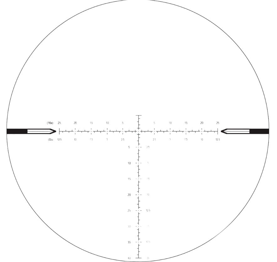 Krzyż MOAR-CF2D to specjalistyczny układ celowniczy zaprojektowany dla strzelców długodystansowych, łączący szybkie trzymania z precyzyjnymi subtensjami — posiada pływający punkt centralny 0,2 MOA dla bardzo dokładnego punktu celowania oraz naprzemienny, intuicyjny wzór oznaczeń (wartości nieparzyste — góra/lewa, parzyste — dół/prawo) ułatwiający natychmiastowe odczyty przy trzymaniach i kompensacji wiatru. Unikalną cechą MOAR-CF2D jest podwójna skala subtensji skalibrowana dla 16x i 32x, co pozwala na poprawne korzystanie z oznaczeń zarówno przy pełnym powiększeniu, jak i przy jego połowie; pierścień zmiany powiększenia jest oznaczony skalibrowaną kropką odpowiadającą skali 16x, umożliwiając szybkie przełączanie między maksymalną szczegółowością a szerszym polem widzenia bez utraty możliwości precyzyjnych odczytów.