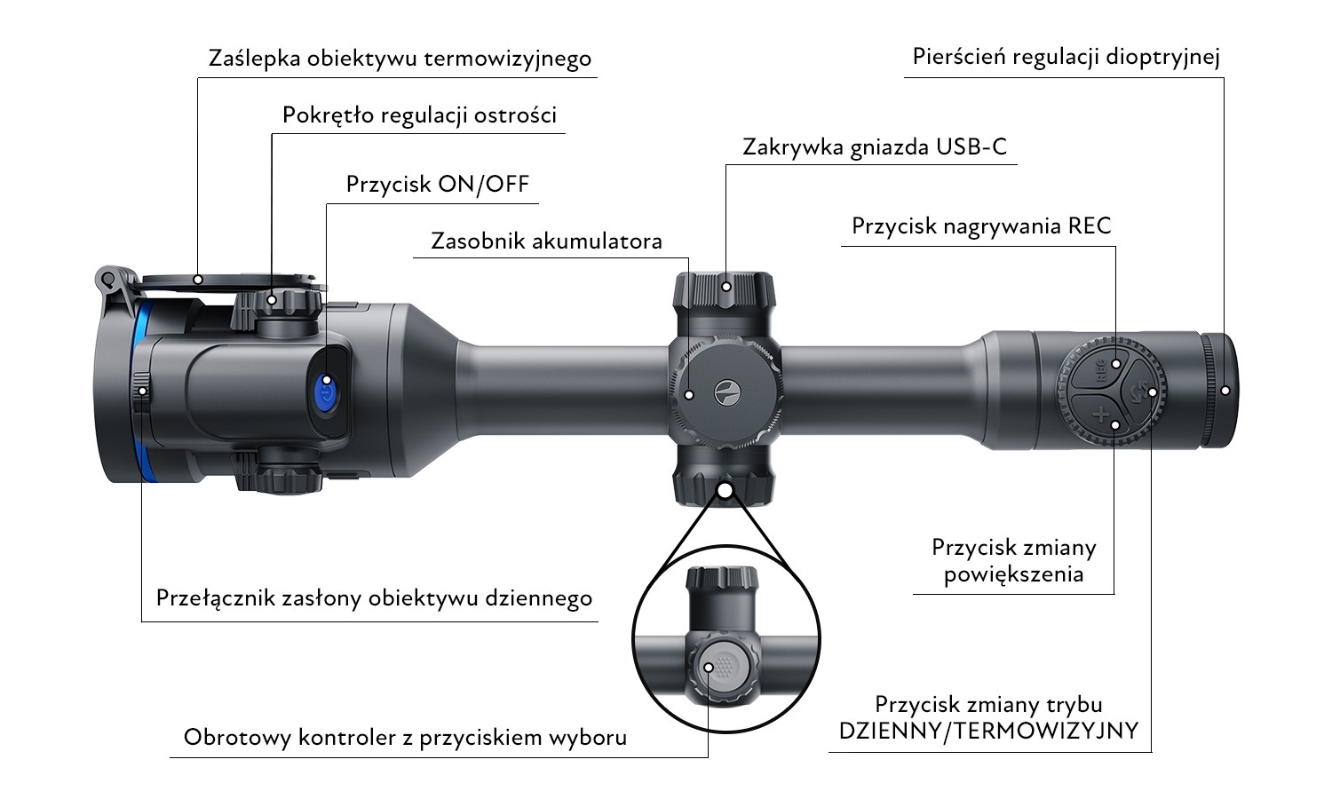 Przełączanie między trybem dziennym a termowizyjnym odbywa się jednym przyciskiem. Funkcja Picture in Picture umożliwia jednoczesne wyświetlanie obrazów z obu kanałów – użytkownik swobodnie wybiera, który obraz ma być główny, a który dodatkowy. Obraz prezentowany jest na mrozoodpornym wyświetlaczu AMOLED HD 1024x768 o odświeżaniu 50 Hz. Tryb termowizyjny oferuje 8 palet kolorystycznych.