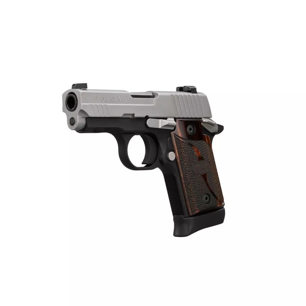 Pistolet Sig Sauer P938 Two-Tone to elegancki subkompakt kal. 9x19 mm, będący pomniejszoną wersją kultowego Colta 1911. Wersja Two-Tone wyróżnia się matowo srebrnym zamkiem ze stali nierdzewnej kontrastującym z czarnym aluminiowym szkieletem oraz srebrnymi manipulatorami i okładzinami z palisandru firmy Hogue, nadającymi broni wyjątkowo elegancki charakter. Pomimo niewielkich rozmiarów i wagi zaledwie 454 g, pistolet oferuje zaskakująco komfortowe i pewne strzelanie bez charakterystycznego „kopania" typowego dla subkompaktów.