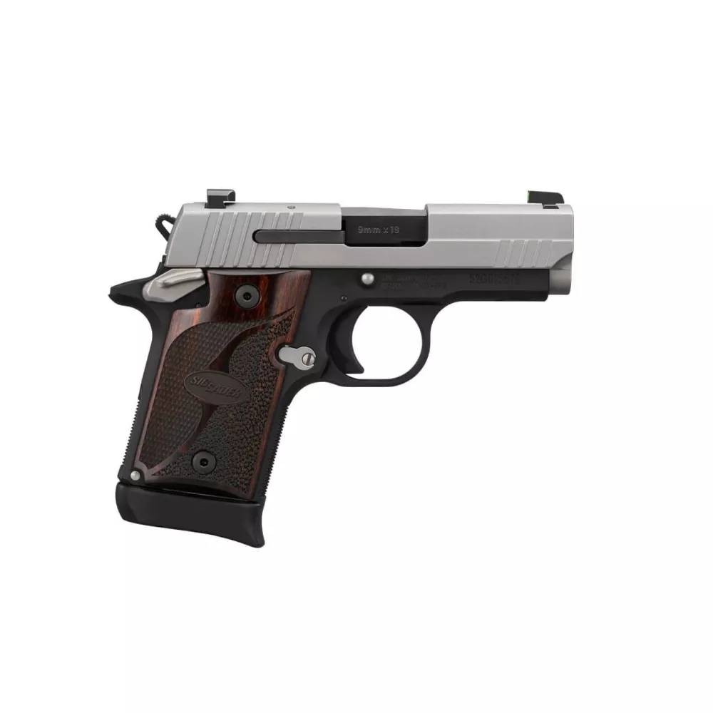 Pistolet Sig Sauer P938 Two-Tone – subkompaktowy kal. 9x19 mm inspirowany Coltem 1911, z mechanizmem SAO, przyrządami XRAY3 z trytem, zamkiem ze stali nierdzewnej i okładzinami z palisandru.