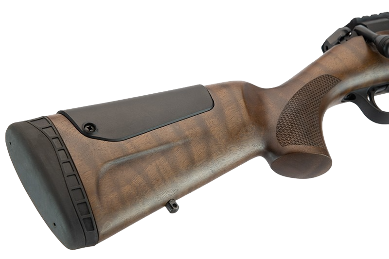Jednym z wyróżników tego modelu jest osada wykonana z wysokiej jakości drewna olejowanego, nadająca broni elegancki i klasyczny wygląd, jednocześnie zapewniając wytrzymałość. Osada jest wyposażona w regulowaną bakę, co umożliwia dopasowanie karabinu do indywidualnych preferencji strzelca. Dodatkowe wyposażenie, takie jak szyna Picatinny oraz lufa zakończona gwintem, zwiększają funkcjonalność broni.